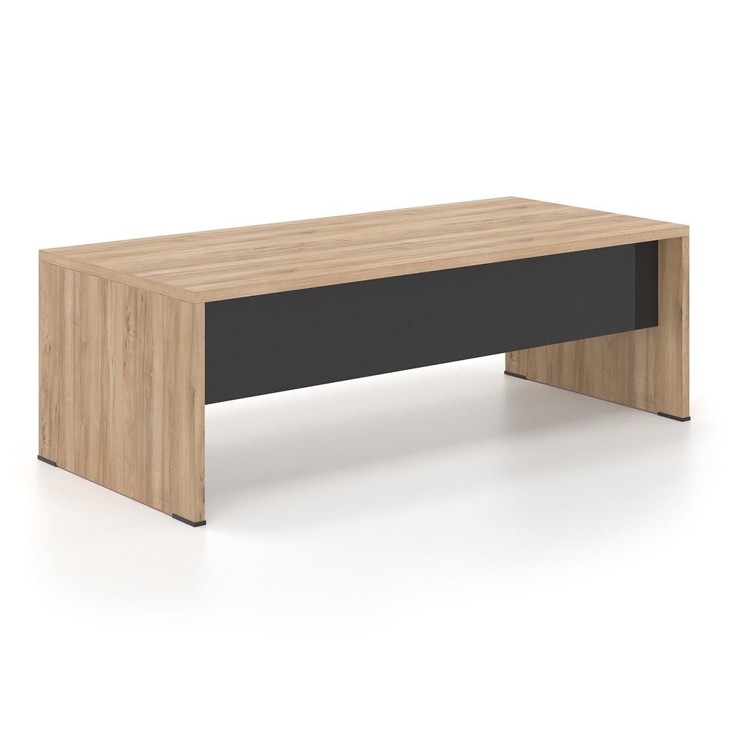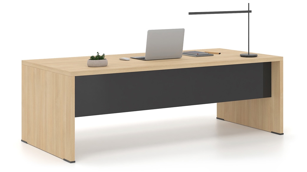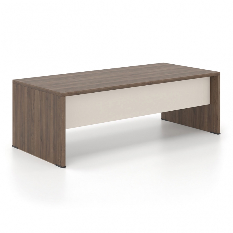 Παράλληλα η μετώπη αποτελείται από μοριοσανίδα μελαμίνης 25 mm και φέρει επικάλυψη γυαλιού extra clear πάχους 4mm σε μαύρο ή μπεζ χρώμα. Επιπλέον, η δυνατότητα ενσωμάτωσης προέκτασης με συρταριέρα, δημιουργούν ένα διευθυντικό γραφείο με γνώμονα την λειτουργικότητα και την υψηλή αισθητική.