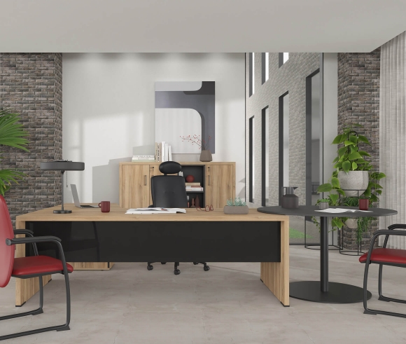 ΥΨΗΛΗ ΑΙΣΘΗΤΙΚΗ – Το εξ ’ολοκλήρου κατασκευασμένο από μοριοσανίδα διευθυντικό γραφείο, αποτελεί μία επιλογή με ιδιαίτερα υψηλή αισθητική για κάθε διευθυντικό στέλεχος που θέλει να προσδώσει κύρος στον χώρο. Η χρήση υλικών υψηλής ποιότητας διασφαλίζουν την αντοχή στον χρόνο. Παράλληλα, η βαμμένη γυάλινη μετώπη έρχεται να συμπληρώσει την επιλογή με άκρως κομψό και διακριτικό τρόπο