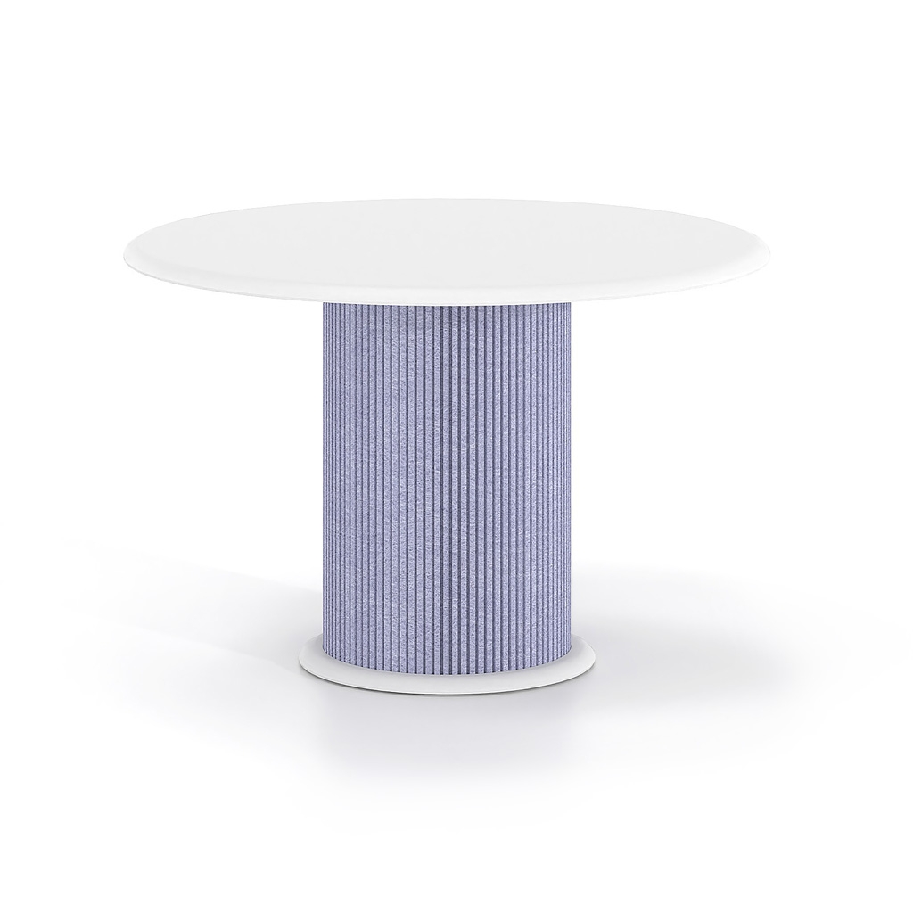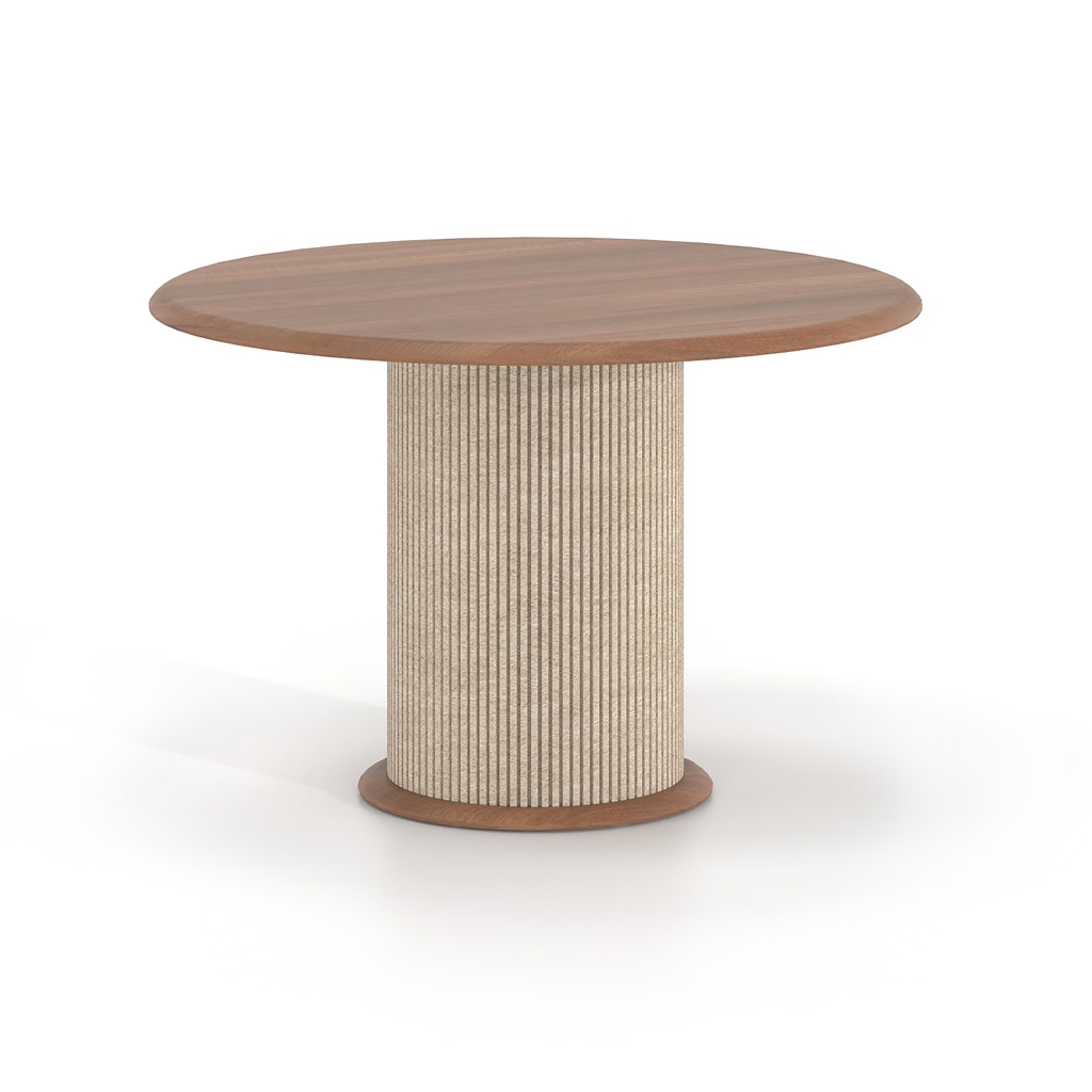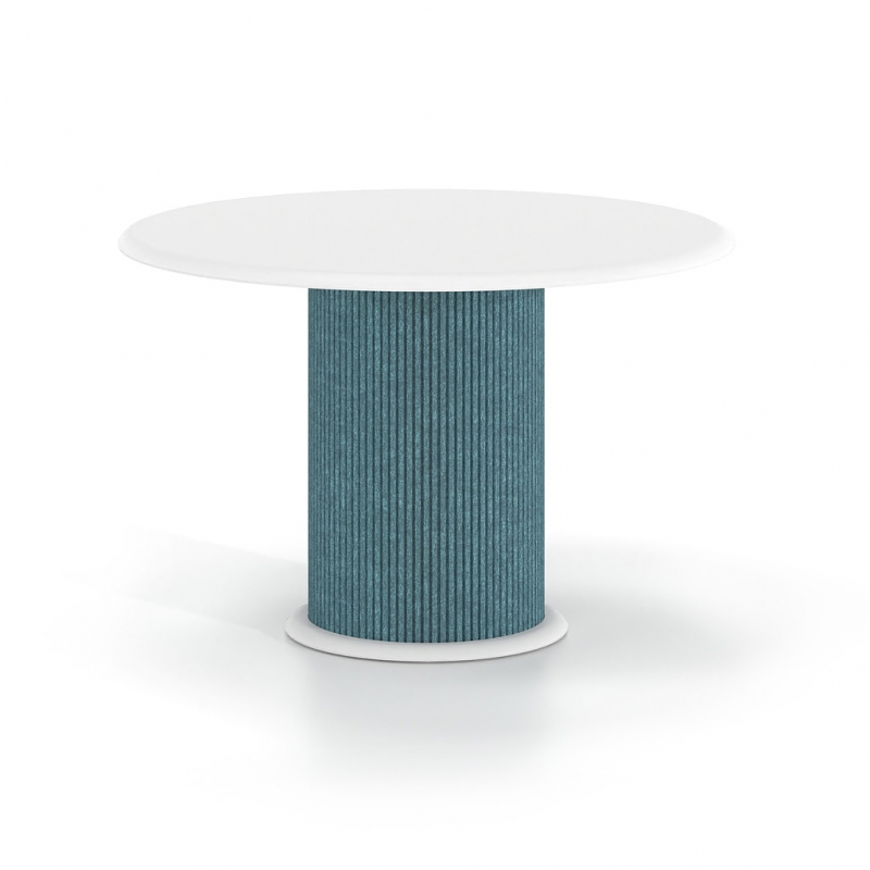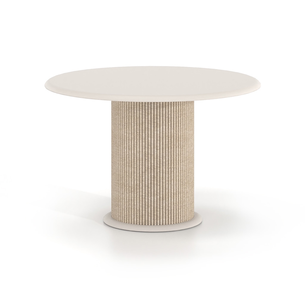 Η κυλινδρική βάση με επένδυση από τσόχα PET προσθέτει υλικότητα και βάθος στο αντικείμενο, δημιουργώντας μια πιο ήπια και φιλική παρουσία στον χώρο. Η επιλογή της τσόχας λειτουργεί συμπληρωματικά στην αρχιτεκτονική του περιβάλλοντος, βελτιώνοντας την ακουστική αίσθηση και ενισχύοντας την ποιότητα του χώρου χωρίς οπτική επιβολή.