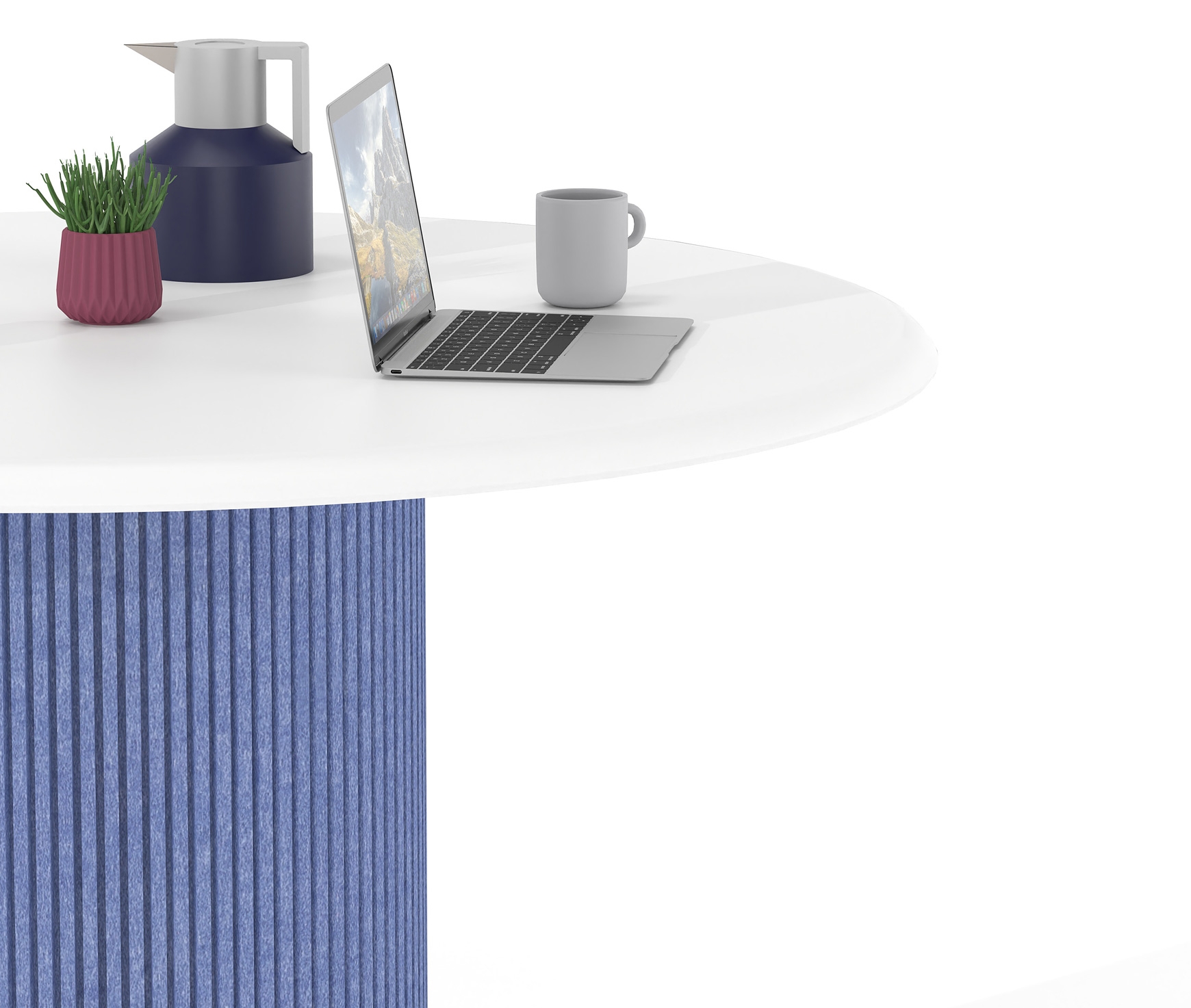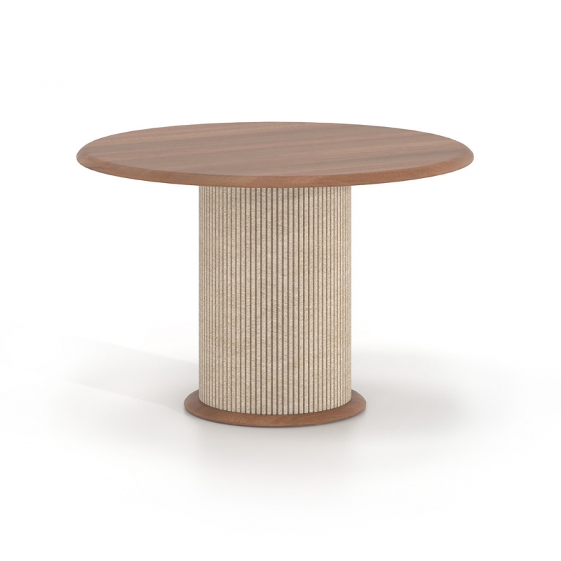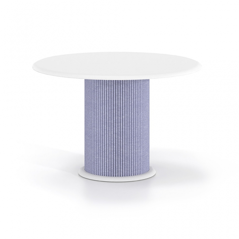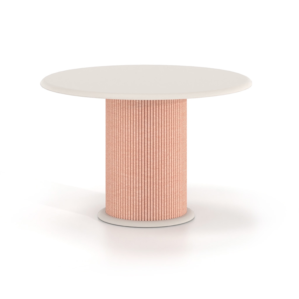 Η κυλινδρική βάση με επένδυση από τσόχα PET προσθέτει υλικότητα και βάθος στο αντικείμενο, δημιουργώντας μια πιο ήπια και φιλική παρουσία στον χώρο. Η επιλογή της τσόχας λειτουργεί συμπληρωματικά στην αρχιτεκτονική του περιβάλλοντος, βελτιώνοντας την ακουστική αίσθηση και ενισχύοντας την ποιότητα του χώρου χωρίς οπτική επιβολή.