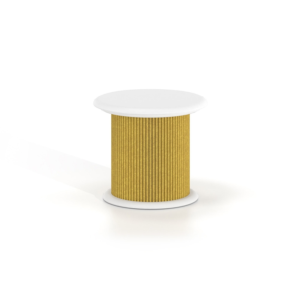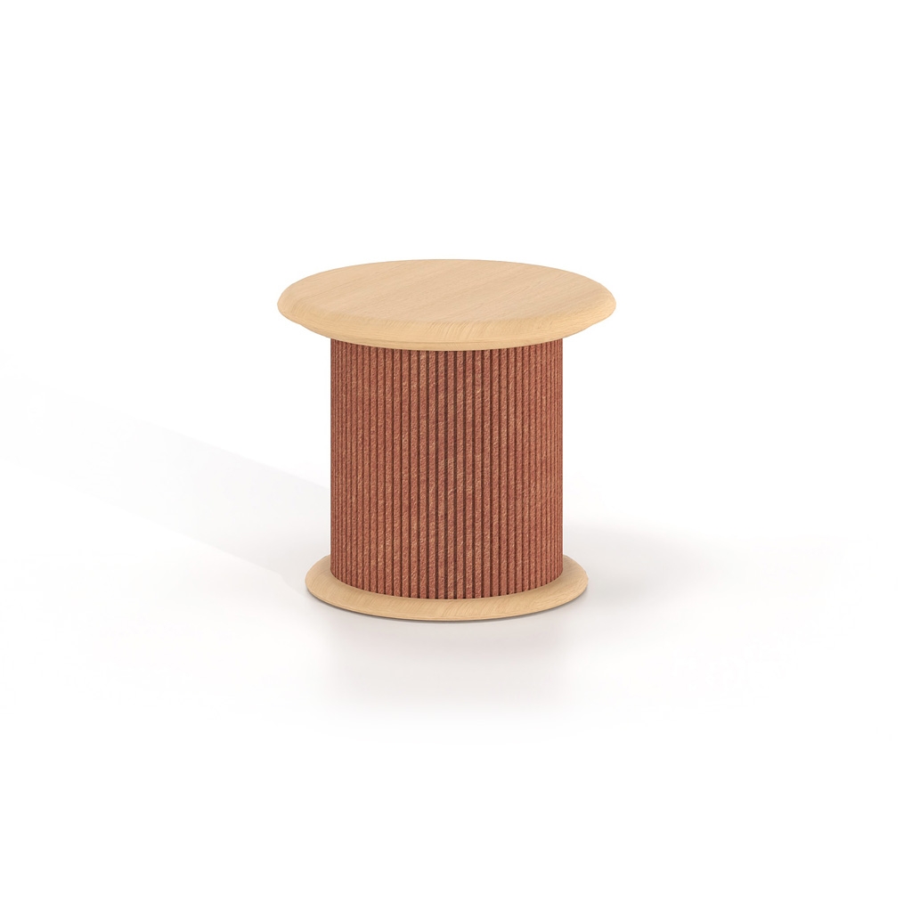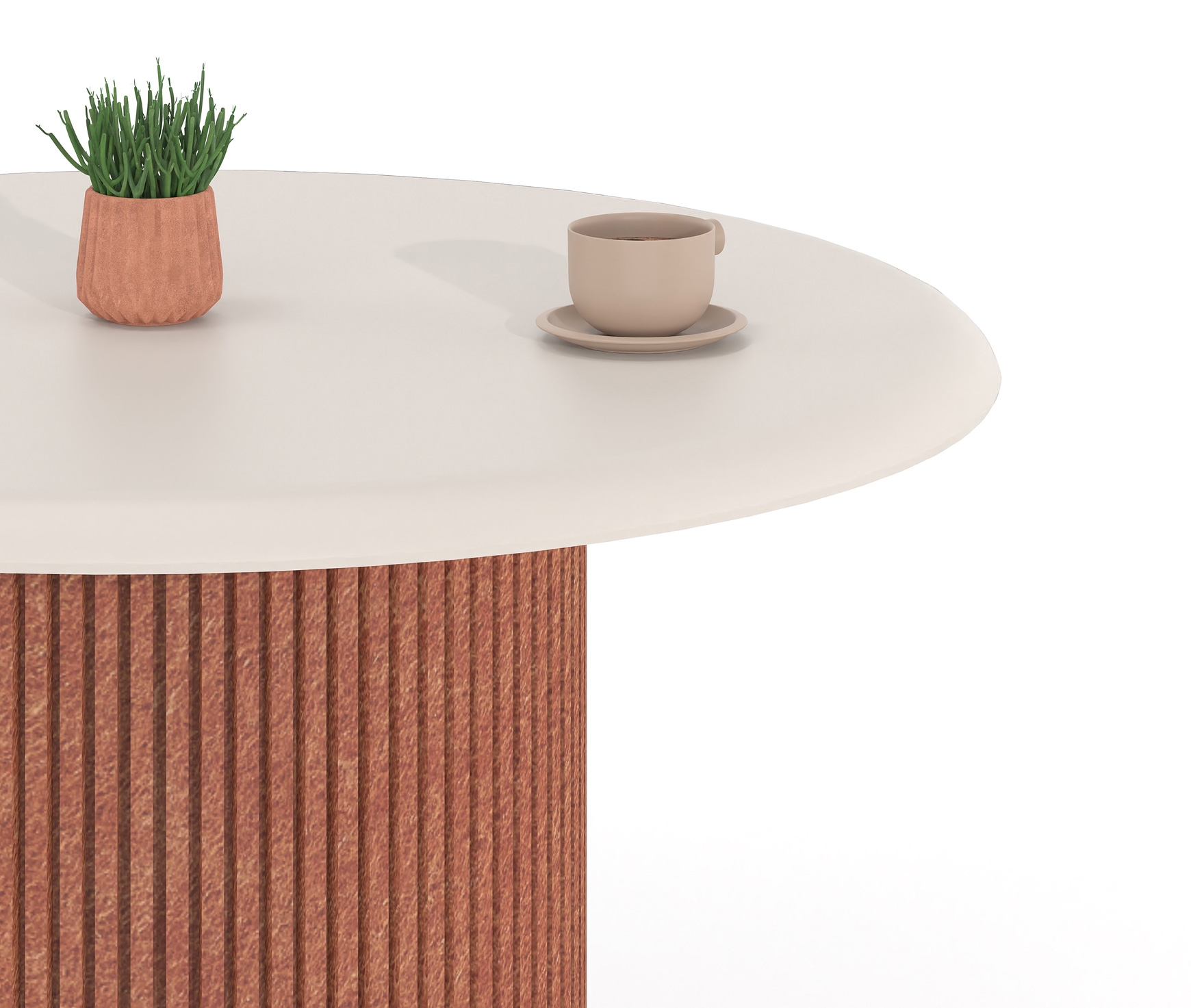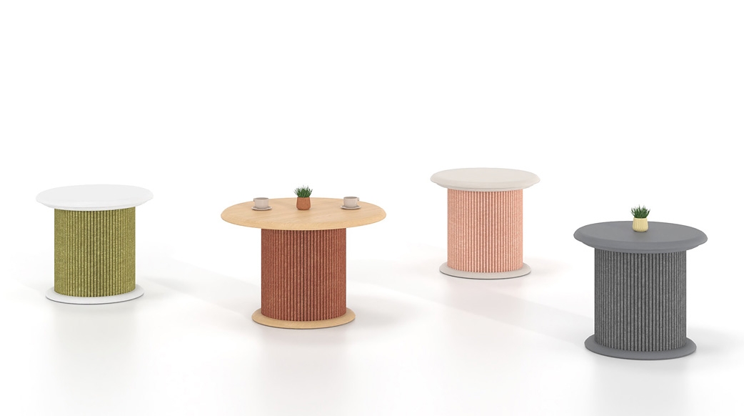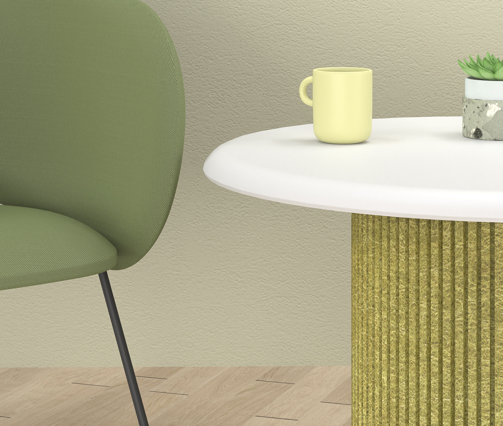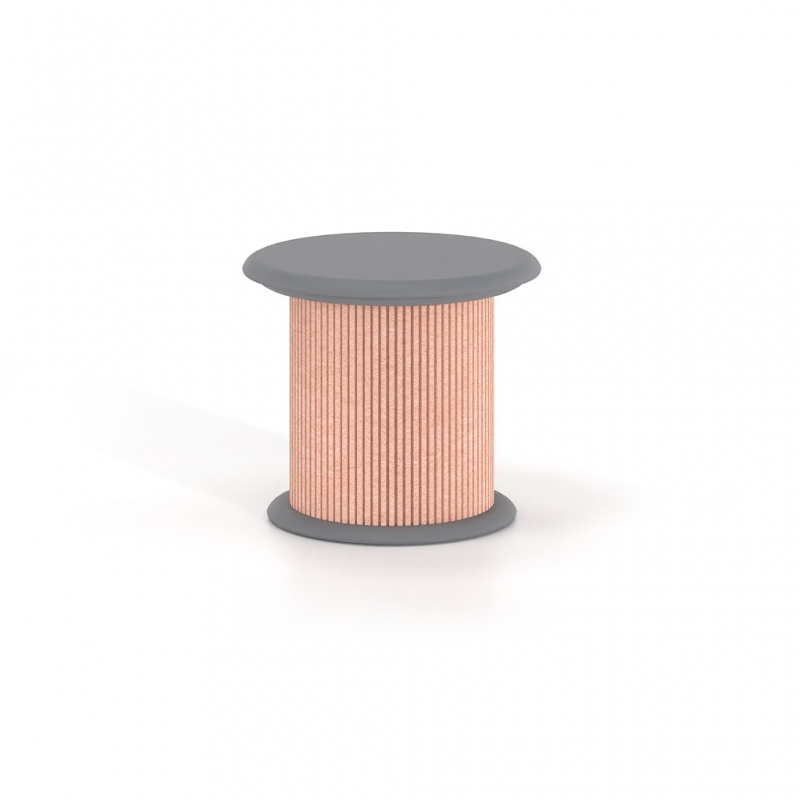 Η κυλινδρική βάση με επένδυση από τσόχα PET προσθέτει υλικότητα και ζεστασιά στο σύνολο, διαφοροποιώντας το τραπεζάκι από τις κλασικές λύσεις αναμονής. Η υφή της τσόχας λειτουργεί συμπληρωματικά στον χώρο, βελτιώνοντας την ακουστική αίσθηση και δημιουργώντας μια πιο ήρεμη και φιλόξενη ατμόσφαιρα.
