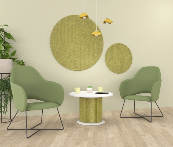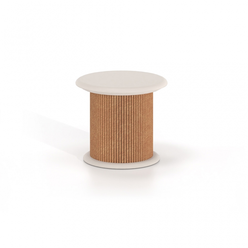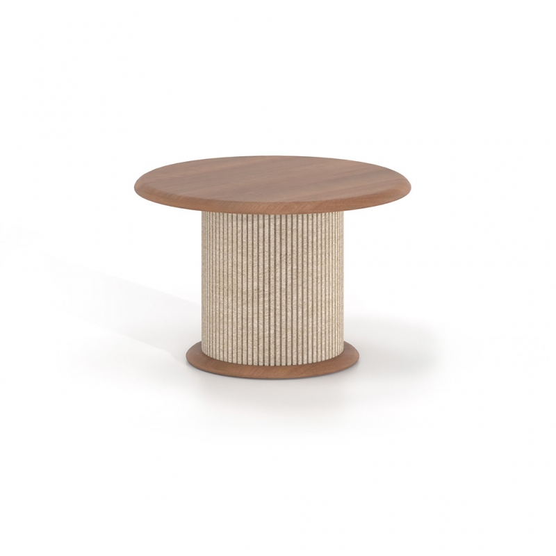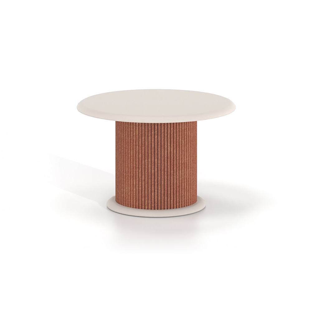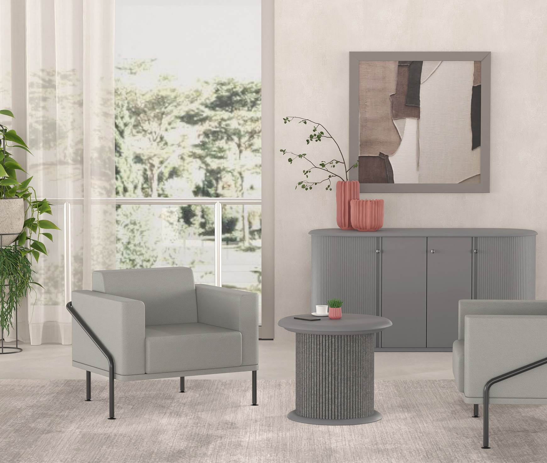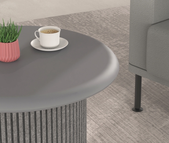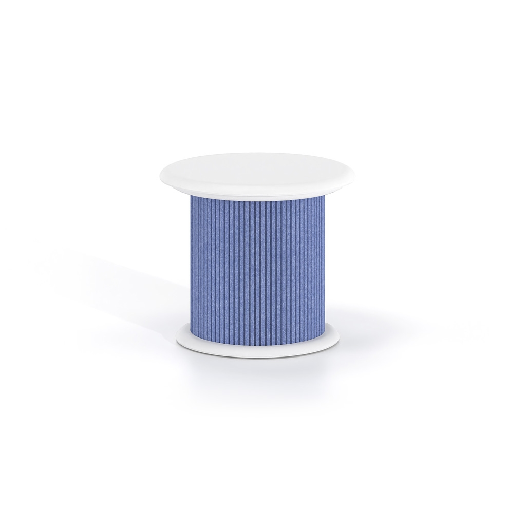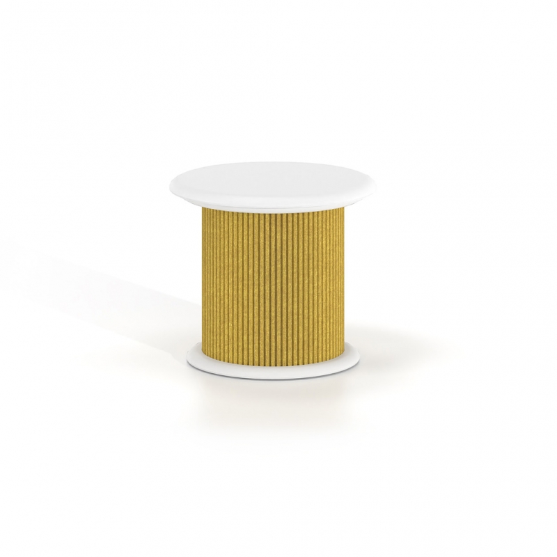 Η κυλινδρική βάση με επένδυση από τσόχα PET προσθέτει υλικότητα και ζεστασιά στο σύνολο, διαφοροποιώντας το τραπεζάκι από τις κλασικές λύσεις αναμονής. Η υφή της τσόχας λειτουργεί συμπληρωματικά στον χώρο, βελτιώνοντας την ακουστική αίσθηση και δημιουργώντας μια πιο ήρεμη και φιλόξενη ατμόσφαιρα.
