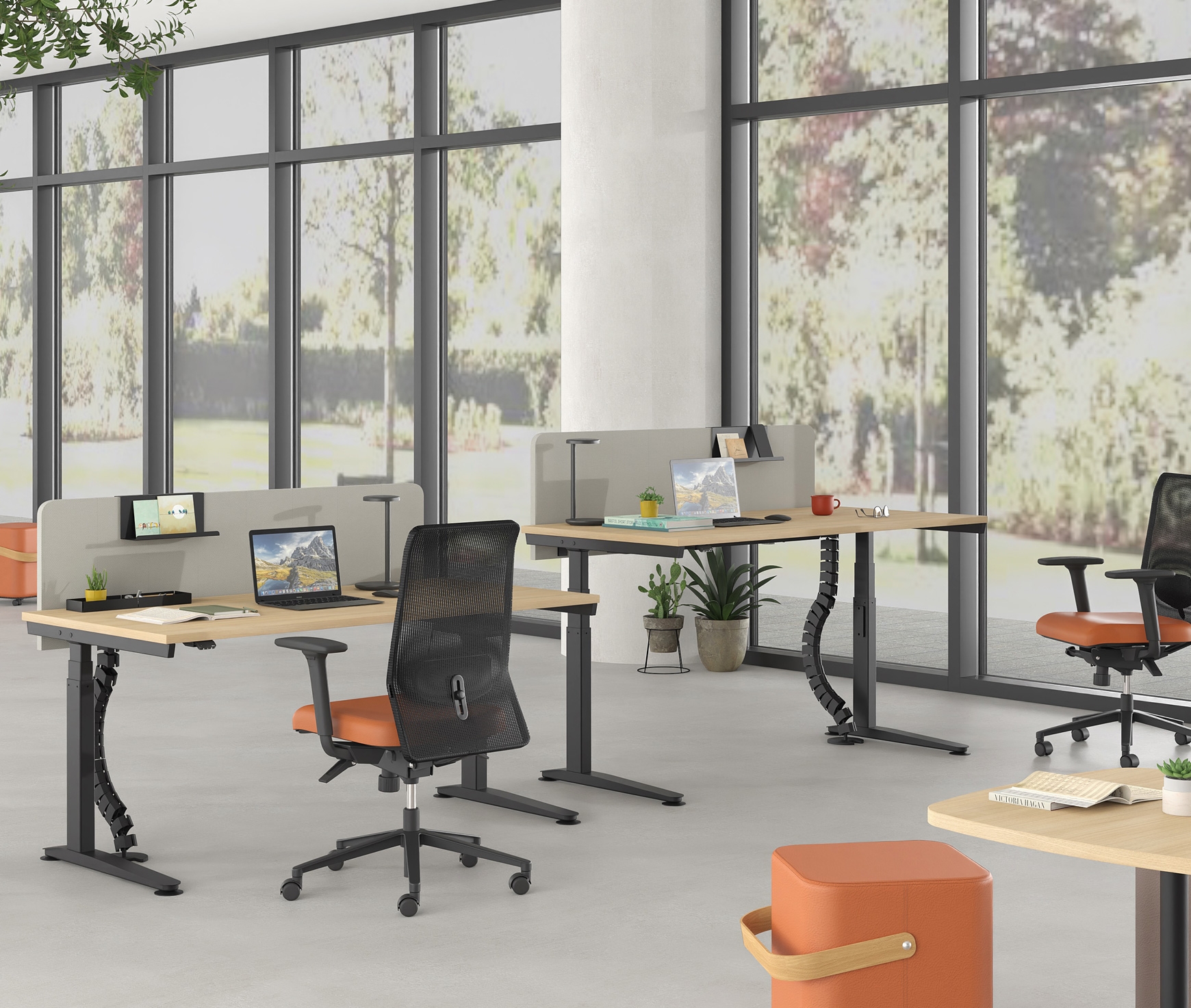 Improve health and well-being during work – studies have shown that being able to switch between standing and sitting positions significantly reduces fatigue, pain and back problems. Like all mechanical systems, the human body obeys physical laws. In the standing position, the load is shared between the ligaments of the vertebrae, in the sitting position the intervertebral discs bear the greatest load. Designing workplaces with a variety of postures and mobility is one way to deal with harmful sedentary lifestyles