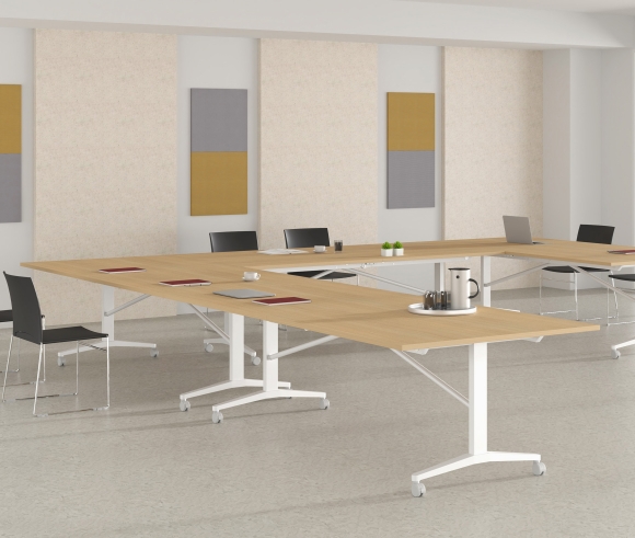 The ALMA CO professional foldable conference desk has the right architecture for long hours of use and maximum flexibility. The foldable surface with the foldable frame make the desk the ideal choice for conference rooms, hotels, catering, classrooms, etc., as they allow quick and appropriate adaptation of the work spaces. It has double wheels with brakes for easy movement. At the same time, the desks have the possibility to develop and connect with each other either horizontally or vertically. In addition, they can be placed next to each other, when they are in the closed position, for maximum space saving. The surface consists of melamine chipboard in various shades.