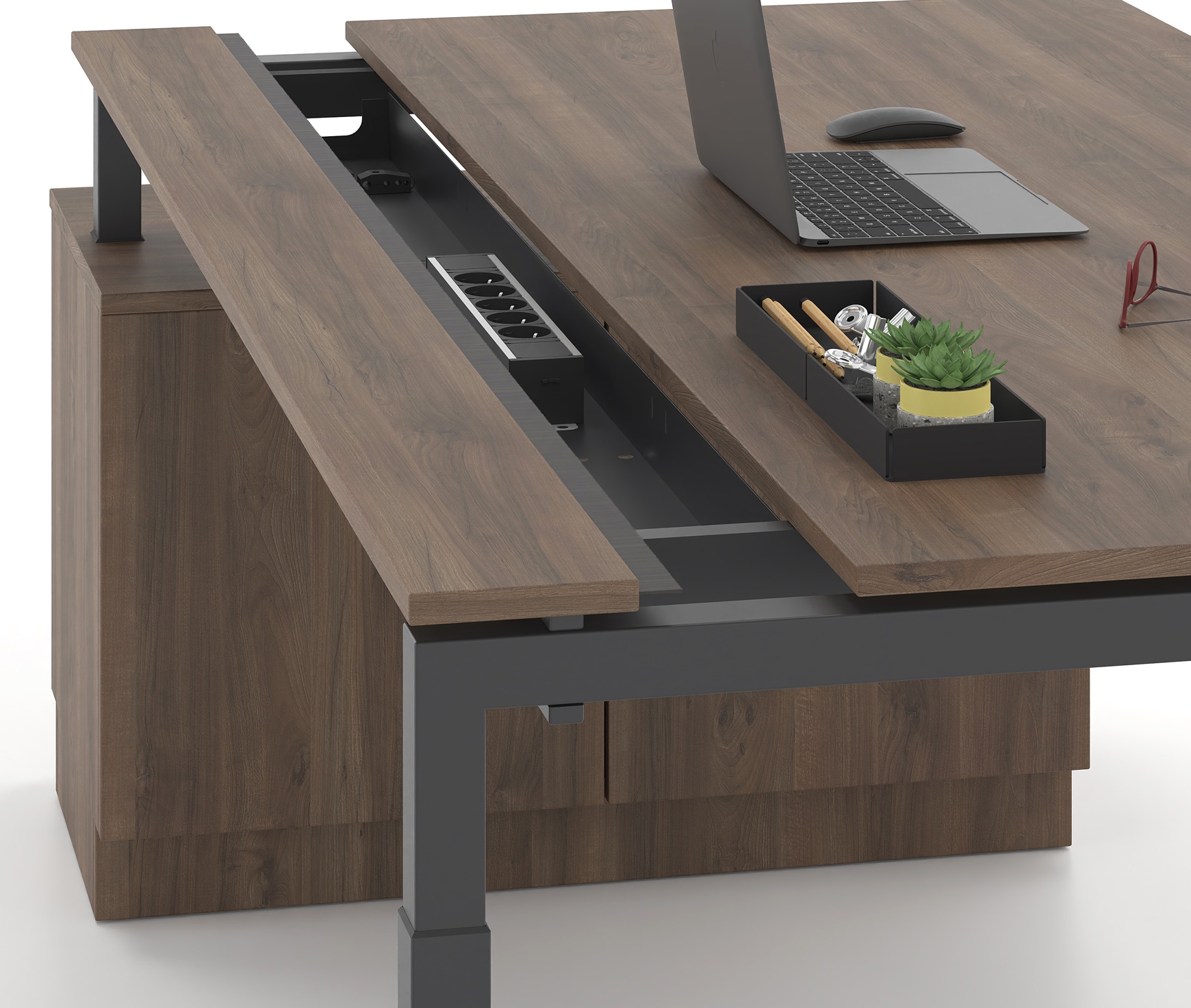 ERGONOMICS – Height adjustment of the work surface 65-85 cm for optimal adjustment of the work position. At the same time, the ease of access provided by the sliding surface, thanks to its robust and quality mechanism, greatly facilitates the user's frequent contact and placement of the power sockets