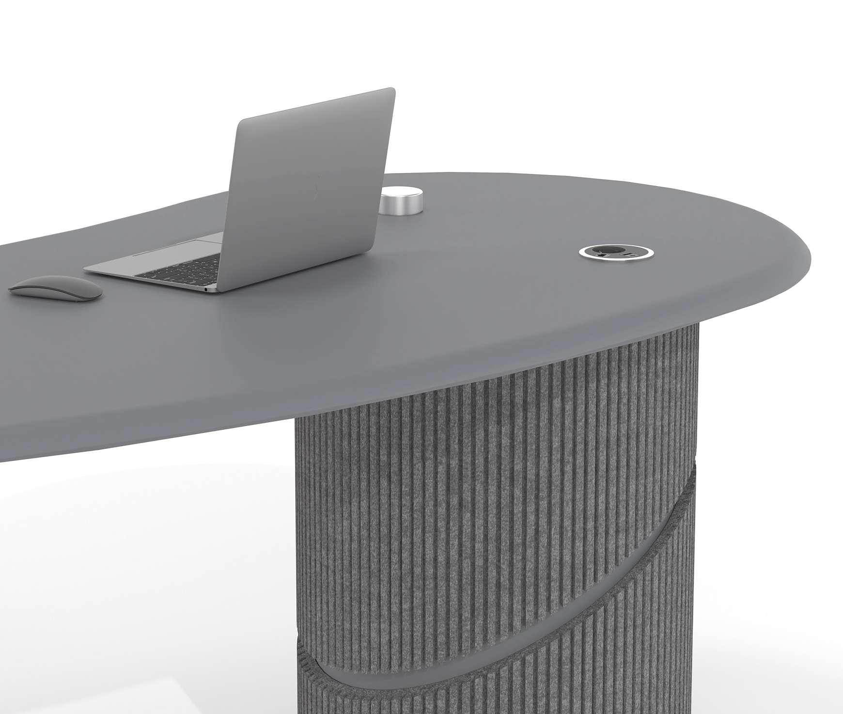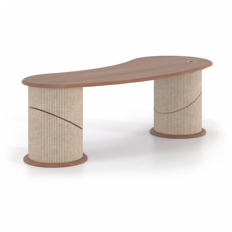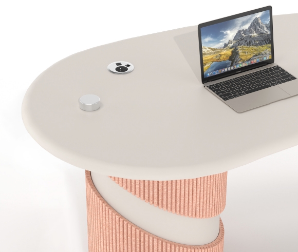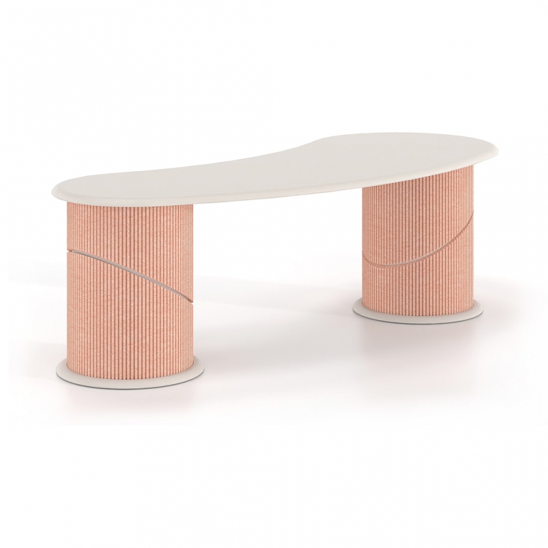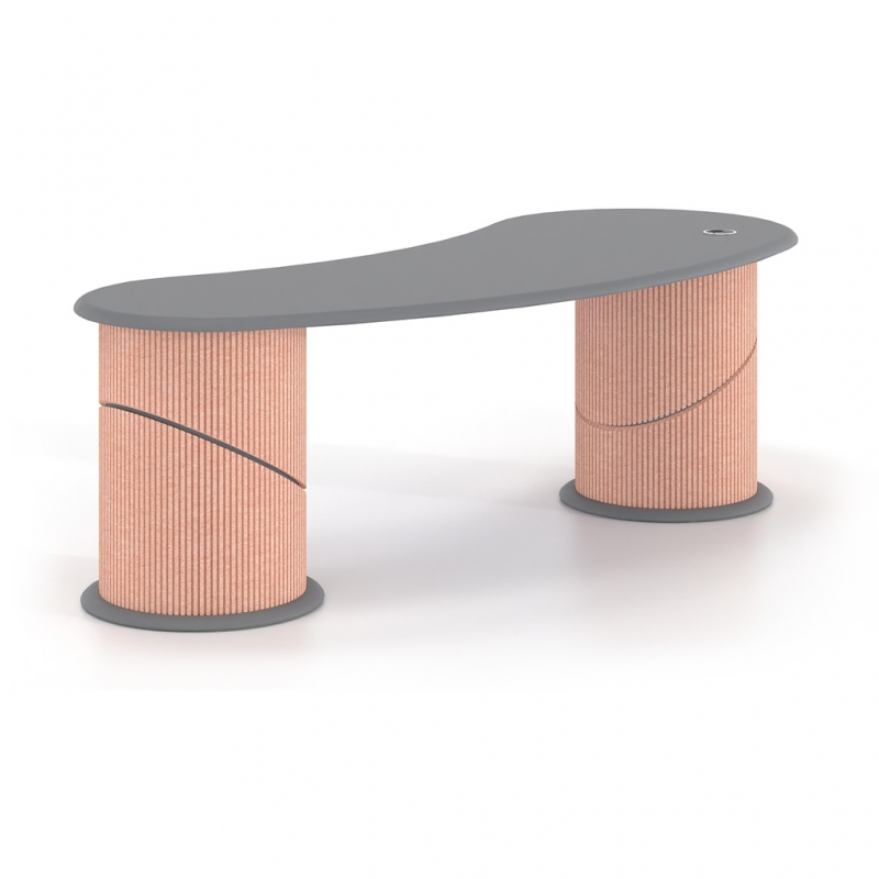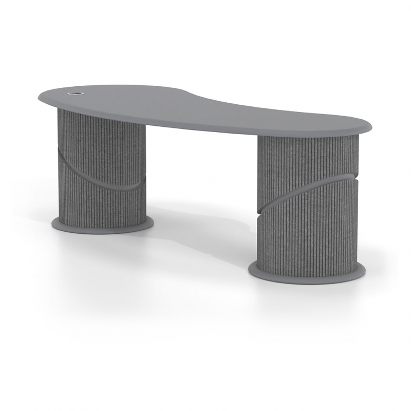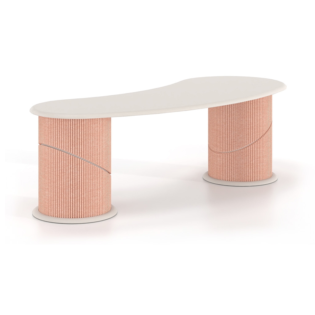 Its sculptural design with organic curves conveys a sense of flow and balance, while the integration of acoustic PET felt on the leg cladding contributes to the reduction of ambient noise. The use of sustainable materials made from recycled PET reinforces the product’s ecological profile, making it an ideal choice for contemporary professional environments.
