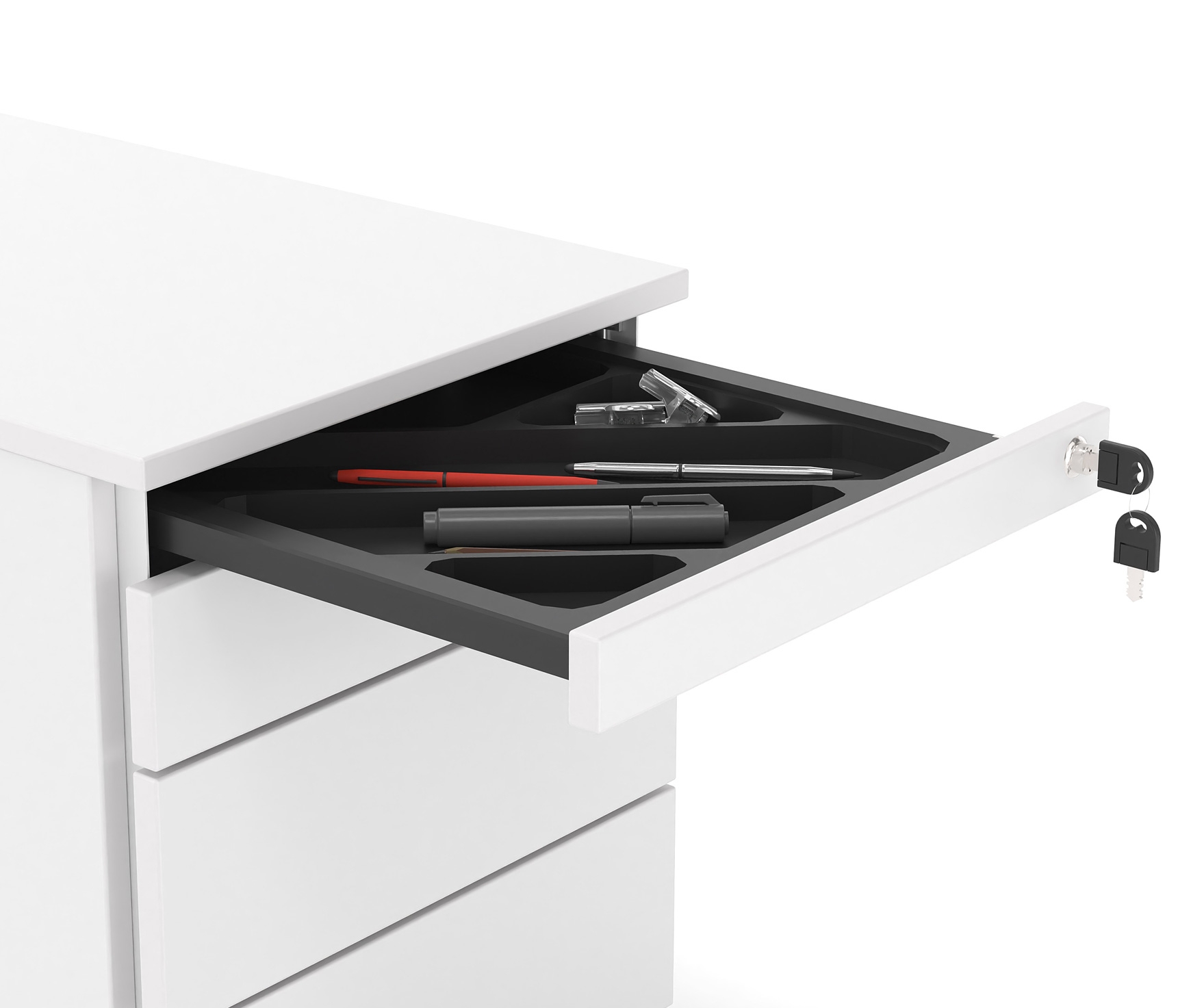 FUNCTIONALITY AND SECURITY – The option of a pencil holder, drawers, card holder and variable position dividers within the drawers makes it easy to organize the workspace. At the same time, the anti-tilt and soft close systems contribute to safety during work