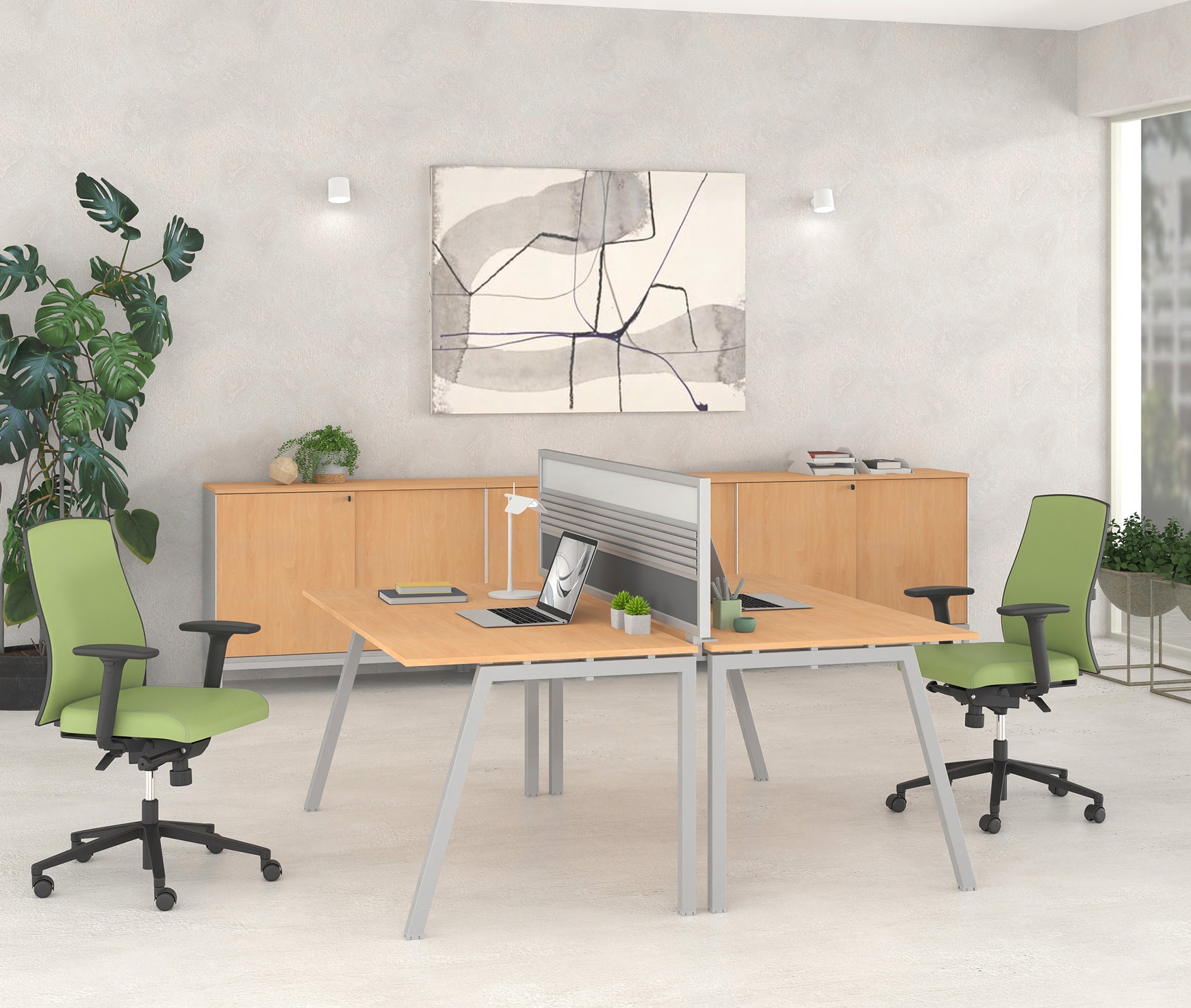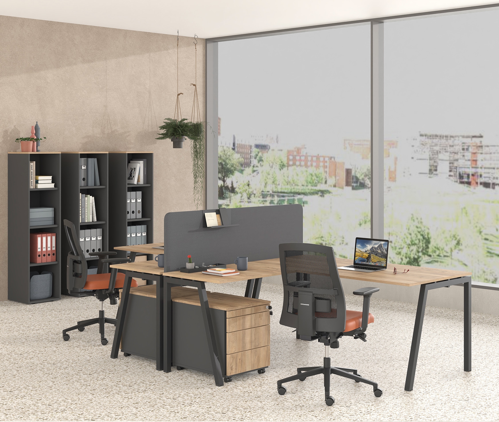 The NEO series is characterized by simplicity and modern design. It is ideal for spaces that require a modern aesthetic approach. It impresses with its simple, clear design expression as well as its high quality. The profile of the series is completed by the optically floating work surface above the metal support frame. The NEW CETO version is differentiated thanks to the anti-symmetrical design of the vertical supports. With the possibility of configuration in color and size, the NEO CETO desks are ideally adapted to any interior space.