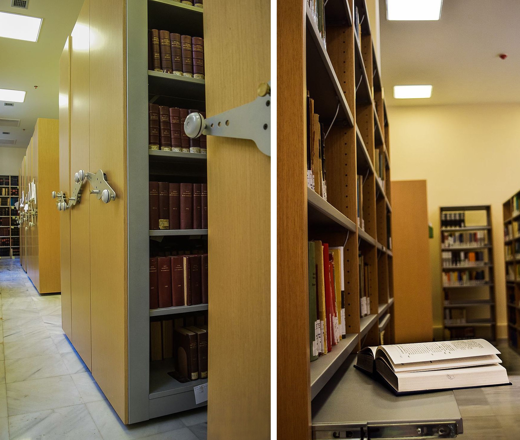 Le déplacement des archives coulissantes s'effectue au moyen d'un système de roues dentées sur une chaîne, qui est installé au sol. De cette manière, on obtient un roulement fluide et silencieux sans risque de glissement lors du déplacement de charges importantes.