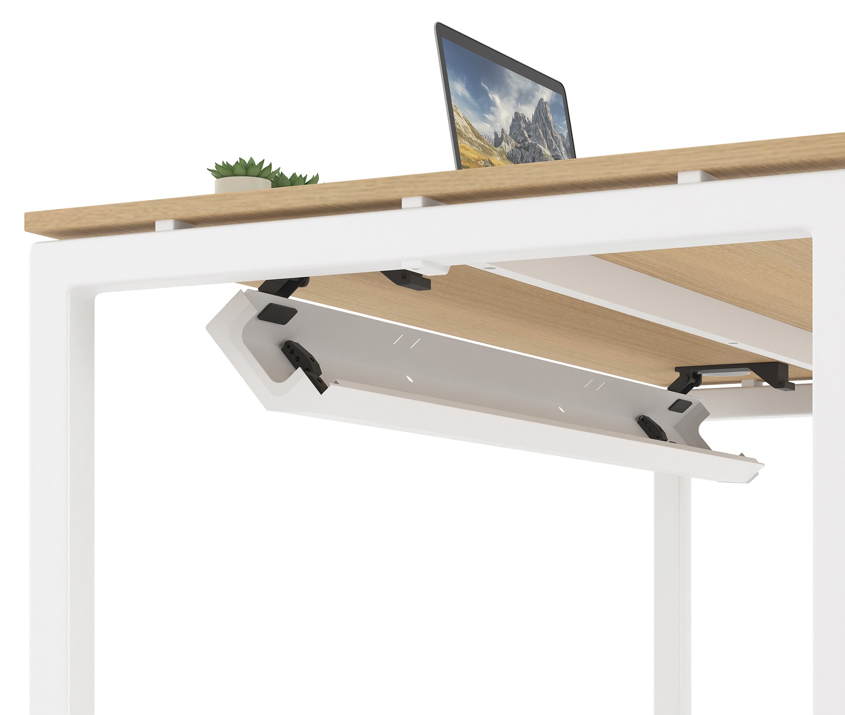 ASSEMBLAGE FACILE - Le cadre de la série NEO est conçu de manière à pouvoir être assemblé très facilement et rapidement. Le cadre métallique est déjà fixé à la surface du bureau et il reste à visser au total 4 vis dans les nœuds de forme spéciale des supports de bureau pour terminer l'assemblage.