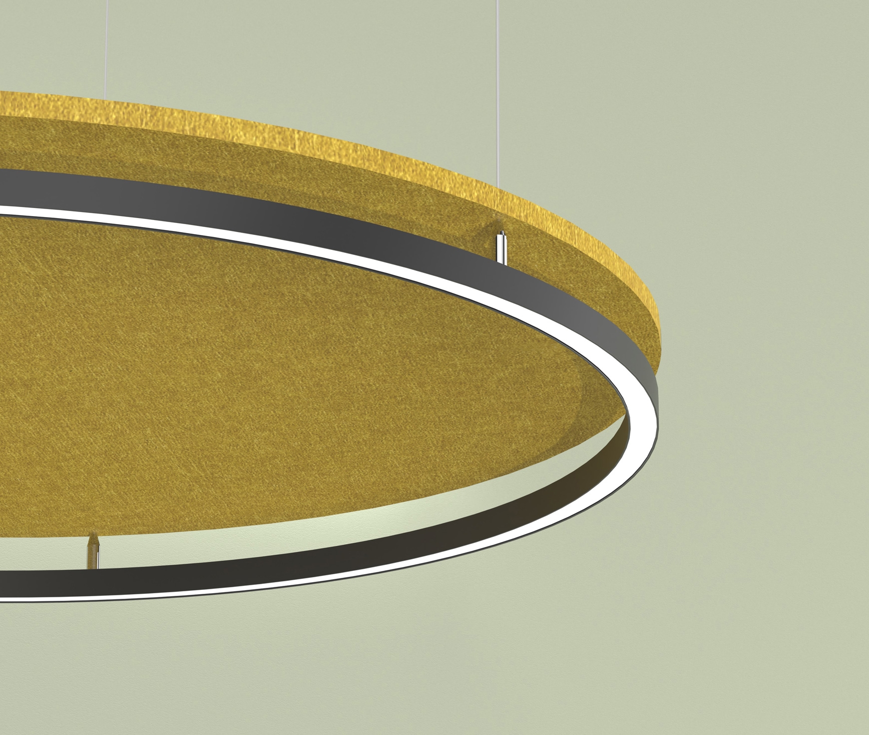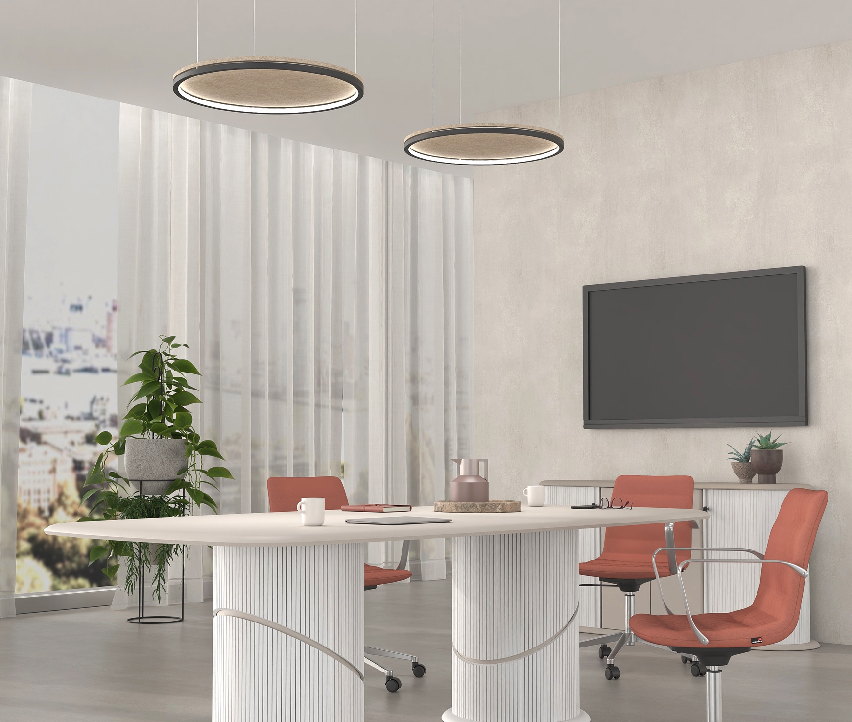 PHOS se distingue par sa présence simple mais dynamique : un anneau plat en feutre PET recyclé qui fonctionne à la fois comme luminaire et élément décoratif. Le feutre PET recyclé offre des propriétés d’absorption acoustique, tandis que le design épuré le rend idéal pour les bureaux, salles de réunion et espaces d’accueil. Disponible en plusieurs couleurs, il permet de s’adapter à différents styles de décoration intérieure.