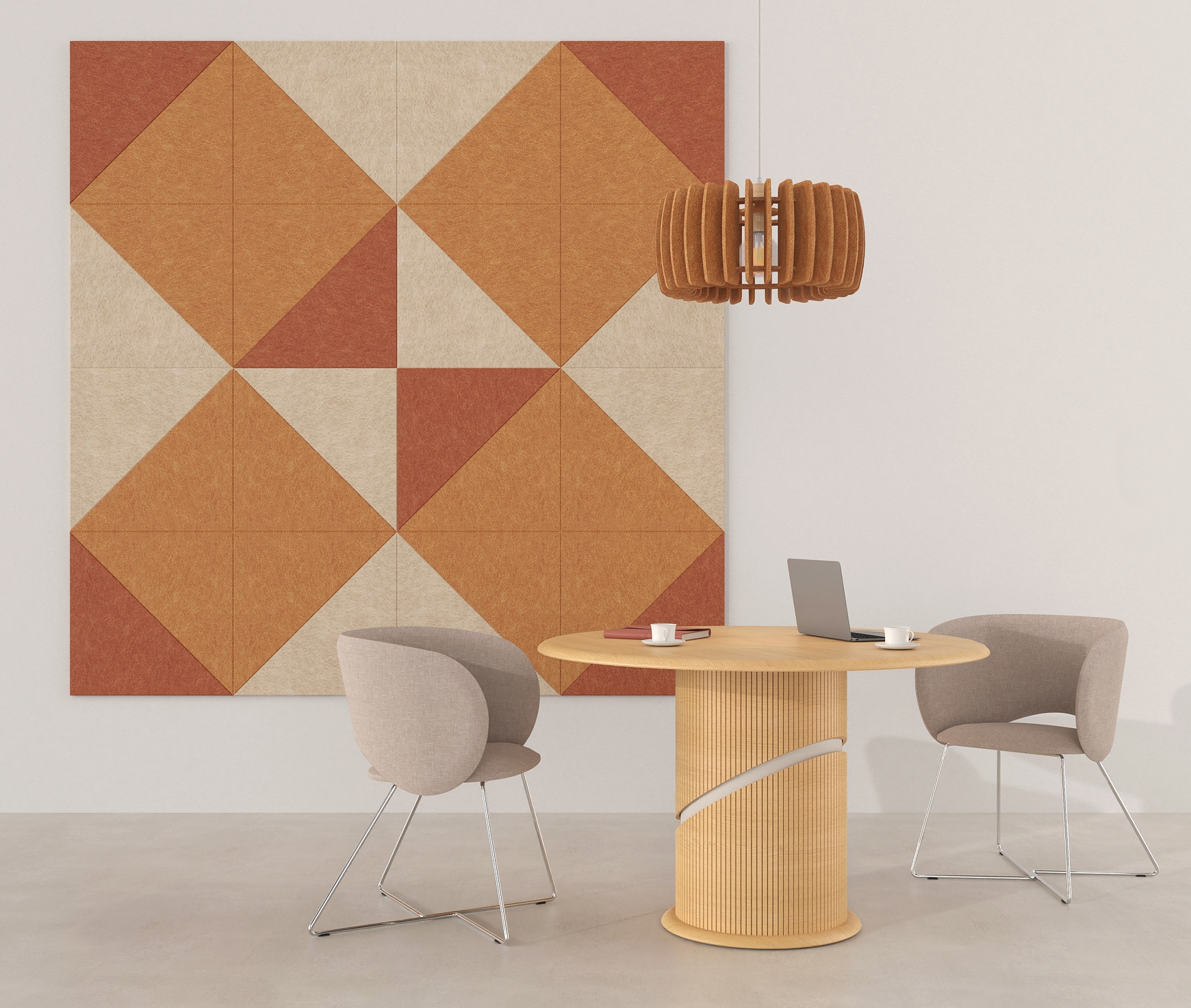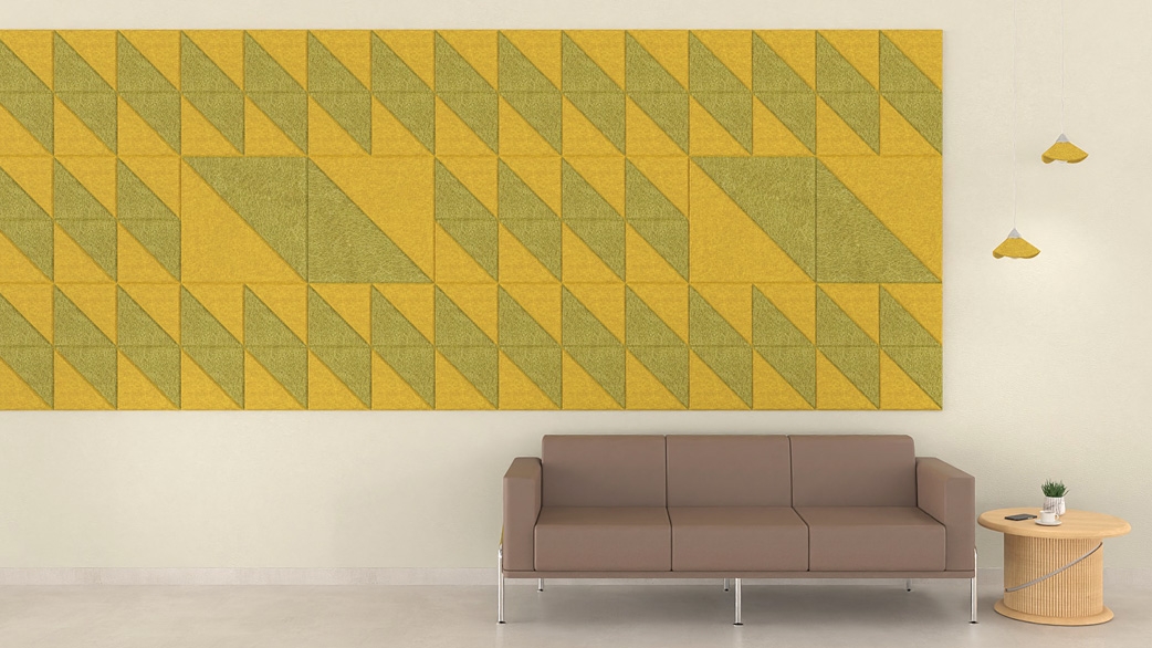Les panneaux acoustiques muraux sont disponibles en formes rectangulaire, carrée et ronde. Ils ont une épaisseur de 18 mm et sont fabriqués en feutre 100 % PET (60 % fibres PET recyclées + 40 % fibres PET vierges), un matériau aux excellentes propriétés d’absorption sonore. L’installation murale s’effectue à l’aide de matériaux de fixation appropriés ou, alternativement, au plafond avec un système de suspension dédié.