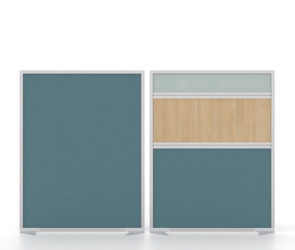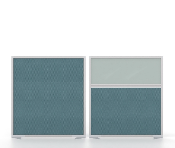 Les cloisons de table sont disponibles en deux hauteurs, 350 et 450 mm, et se fixent à la surface du bureau à l'aide de connecteurs en aluminium moulé sous pression. Elles peuvent être reliées entre elles en forme de croix, de T ou même en ligne droite. En option, il est possible d'y fixer des accessoires de bureau supplémentaires, tels que des bras pour écrans. Les cloisons suspendues peuvent être équipées de rideaux en aggloméré E1 avec revêtement en mélamine ou en tissu, en verre transparent ou sablé chimiquement.