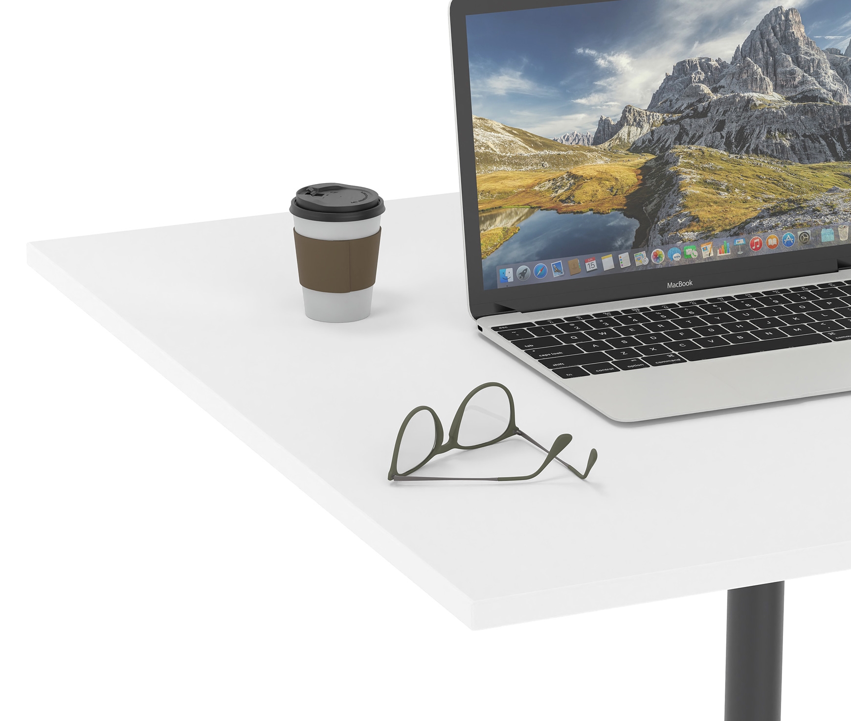 La surface est en panneaux de particules mélaminés dans différentes nuances parmi lesquelles vous pouvez choisir celle qui s'intègre parfaitement dans votre espace. Le cadre est peint avec de la peinture électrostatique et il est disponible dans une variété de couleurs. Le piètement à 4 branches est en aluminium moulé sous pression poli et possède des patins protecteurs antidérapants.